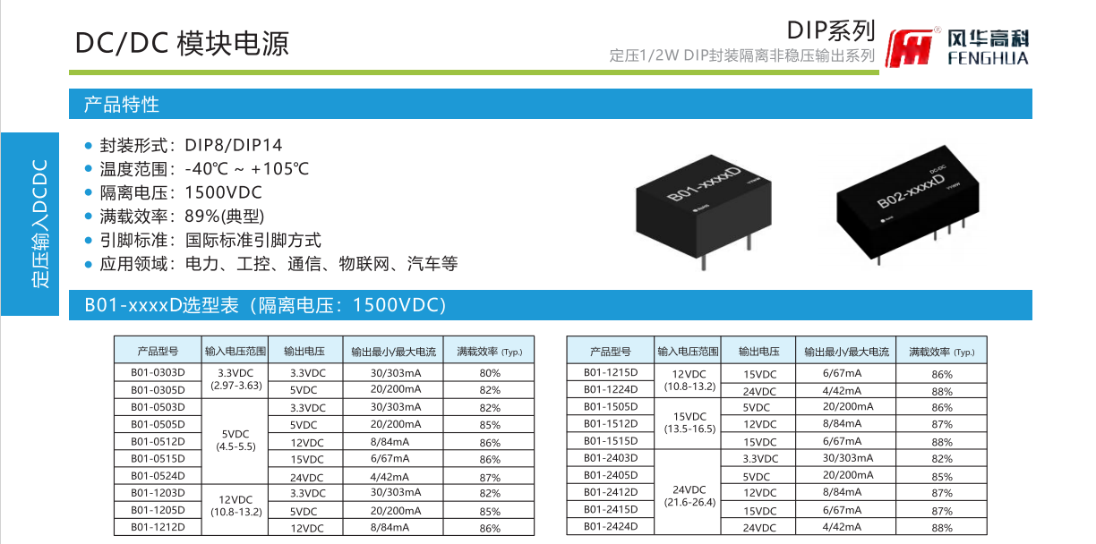 产品特性:封装形式:DIP8/DIP14温度范围:-40℃~+105℃.隔离电压:1500VDC满载效率:89%(典型)引脚标准:国际标准引脚方式应用领域:电力、工控、通信、物联网、汽车等